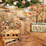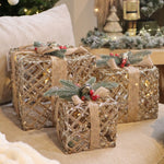 Breng je interieur tot leven met deze schitterende cadeauset in goudkleurig metaal. De subtiele LED-verlichting laat het geheel fonkelen en zorgt voor een magische kerstsfeer. Perfect om onder de kerstboom of bij de haard te plaatsen voor een feestelijke en stijlvolle uitstraling.